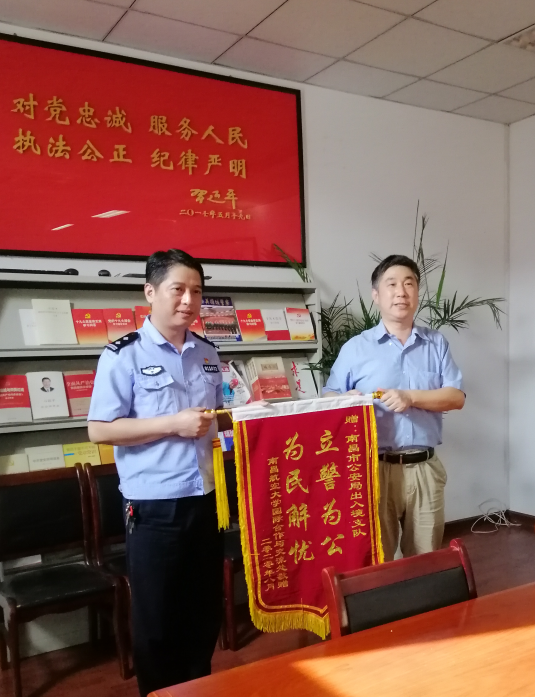 9月1日下午,为感谢南昌市公安局出入境支队在疫情期间为我校公派留学生办理护照提供的无私帮助,国际合作与交流处、国际创新研究院领导专程赴南昌市公安局出入境支队赠送“立警为公,为民解忧”锦旗一面,对市局高效办事、优质服务表示谢意。